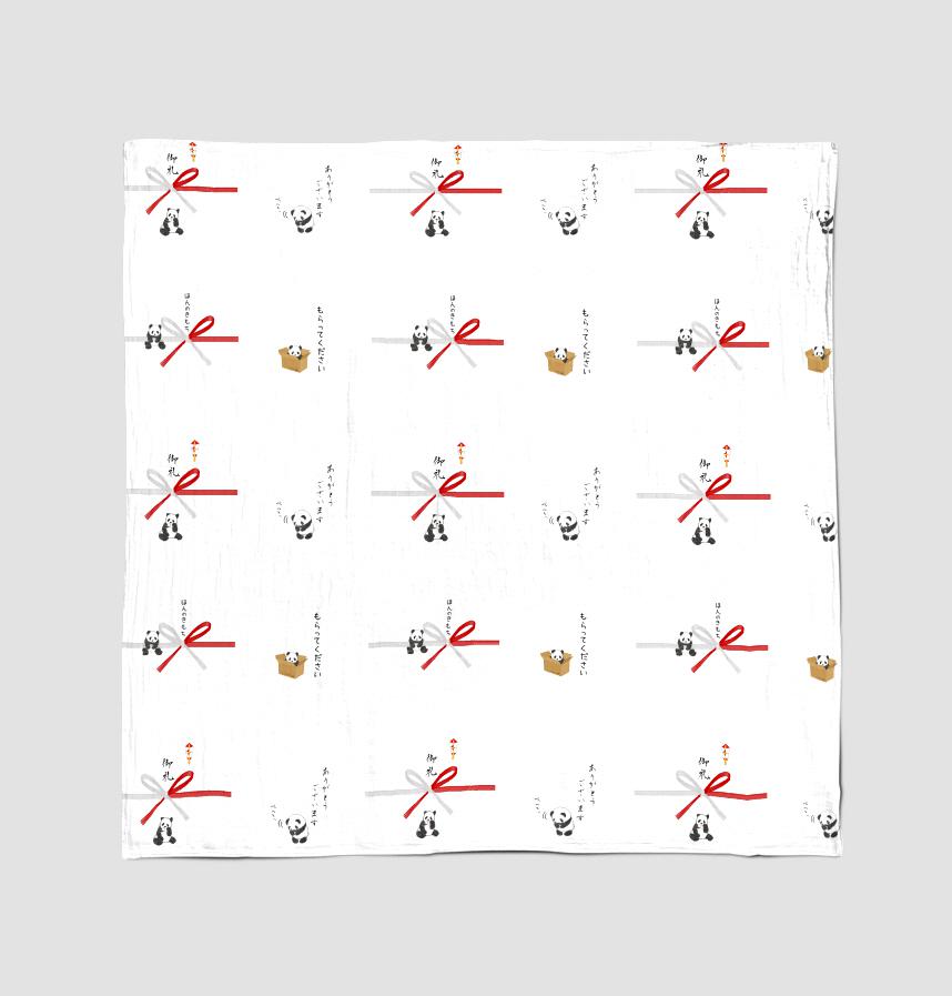 There are pandas in cardboard boxes saying "please take this", hanging from them, and pandas looking happy after receiving gift envelopes. It's a cute and interesting pattern.