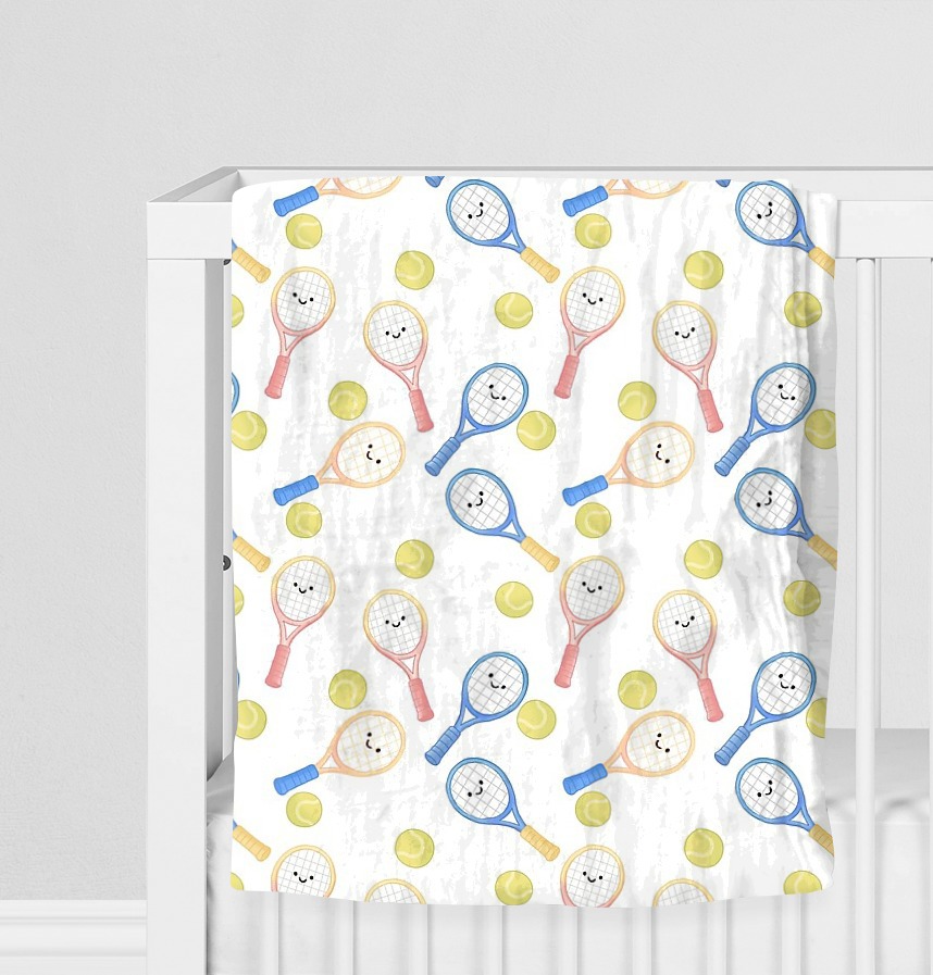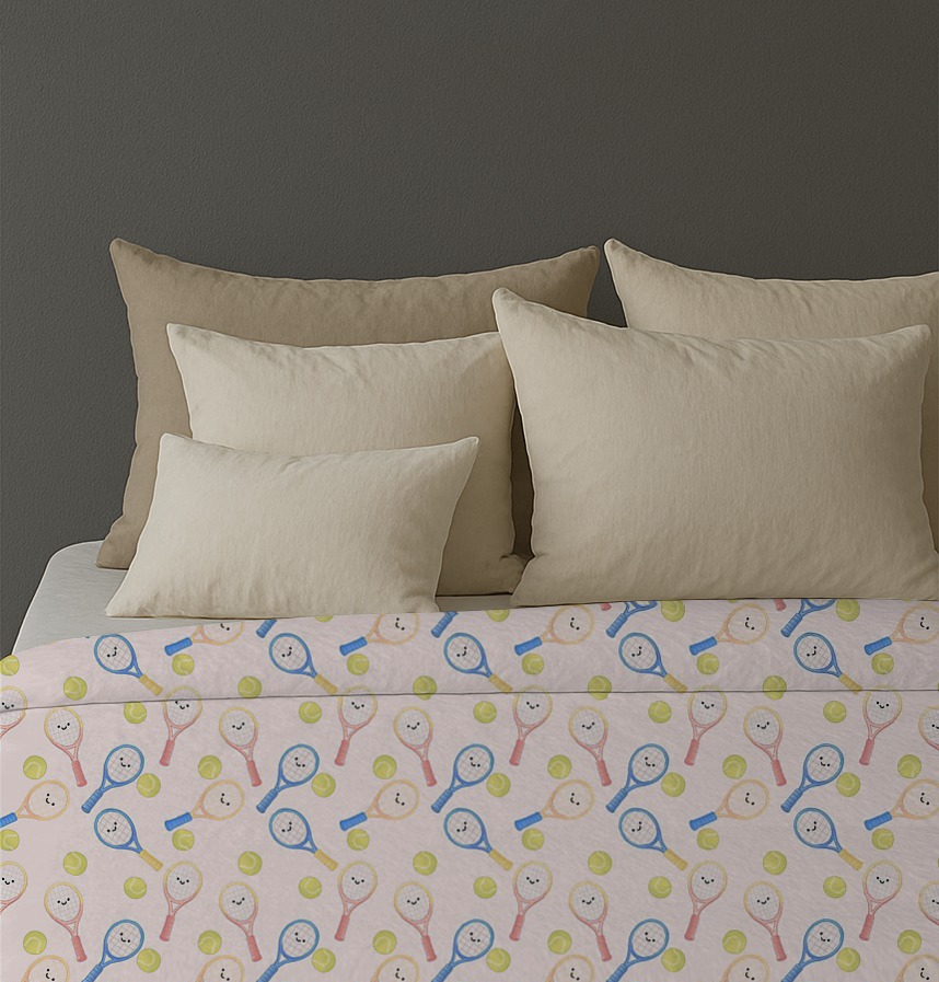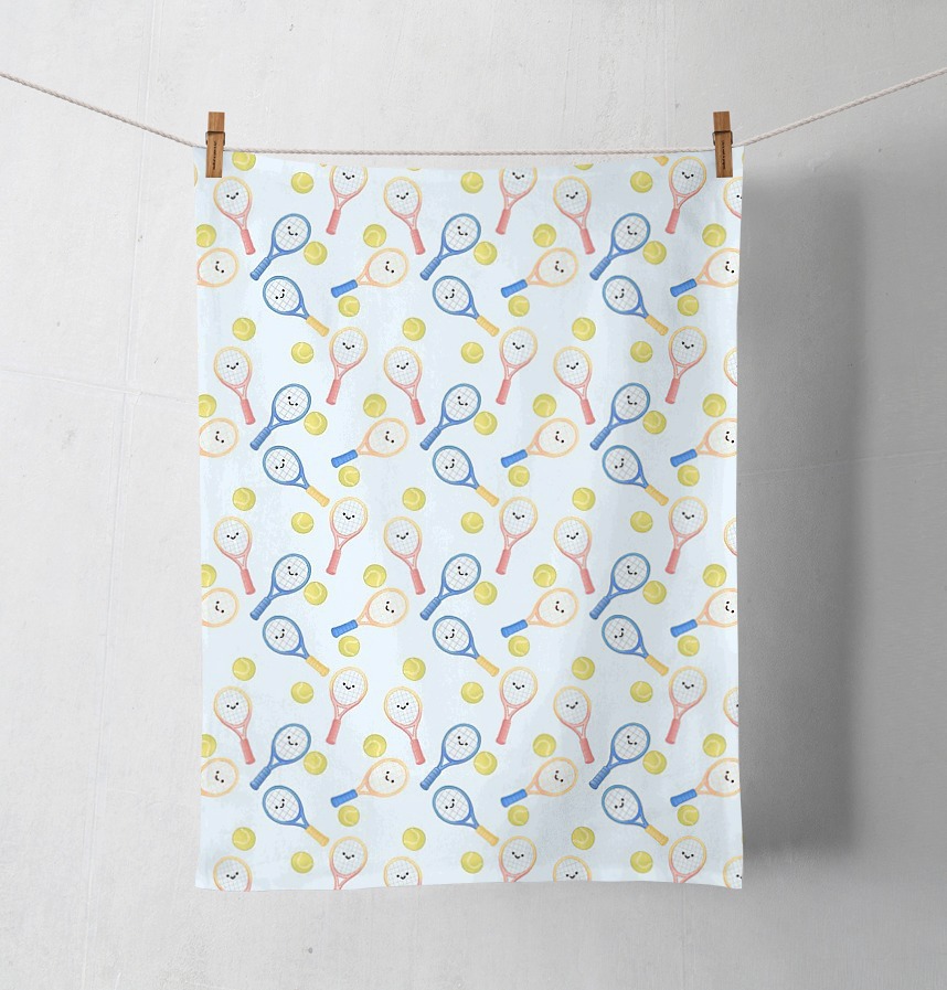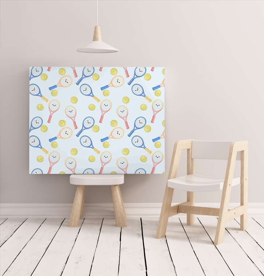 This design is an illustration pattern featuring a tennis racket and a tennis ball with cute expressions placed on a pastel background.