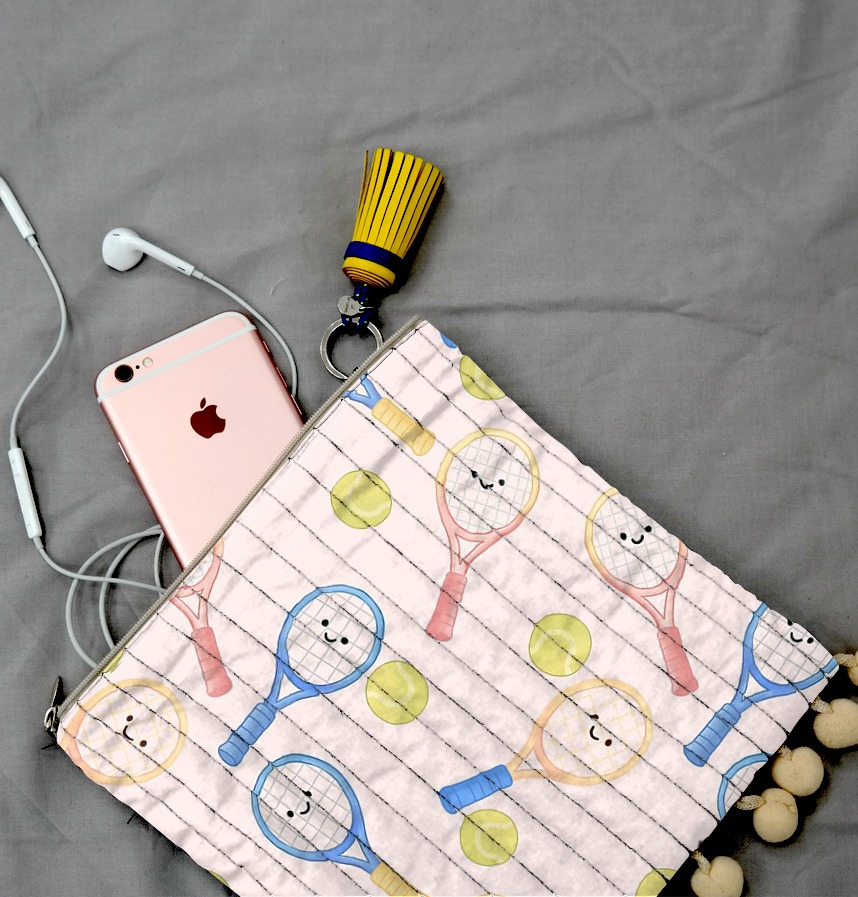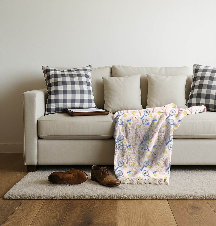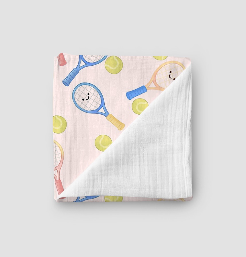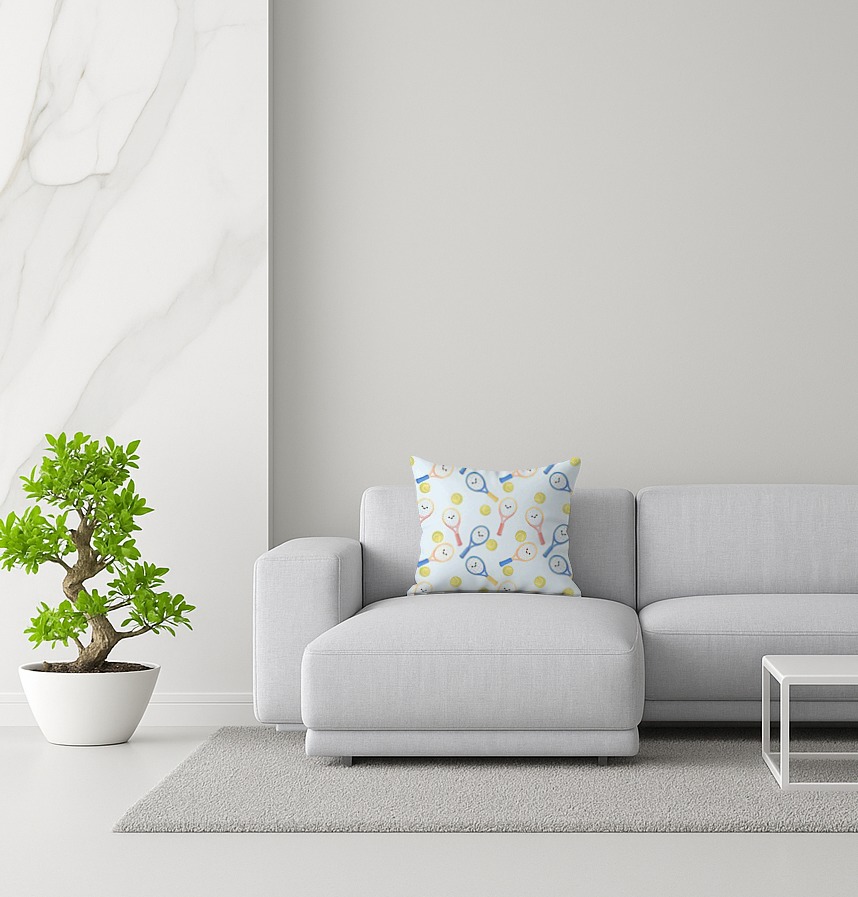 This design is an illustration pattern featuring a tennis racket and a tennis ball with cute expressions placed on a pastel background.