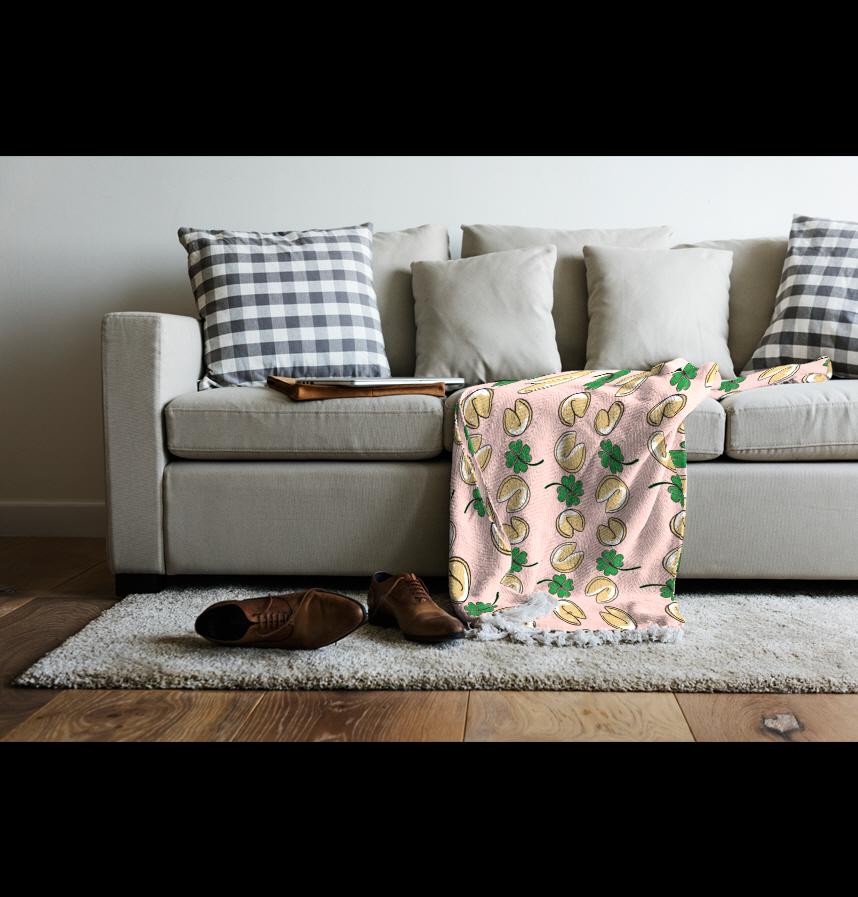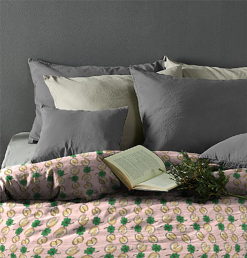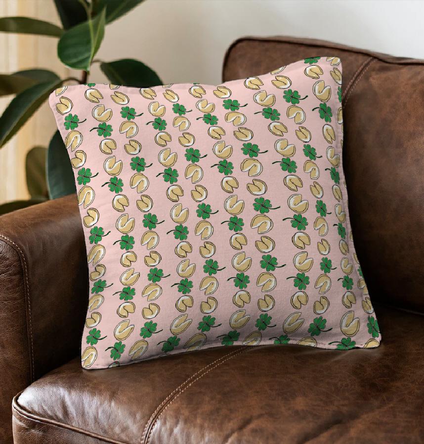 This pattern combines four-leaf clovers and fortune cookies , which symbolize good luck, to convey a positive message and warm atmosphere. The clean and intuitive design matches well with various colored backgrounds, and the repeated elements provide visual stability.