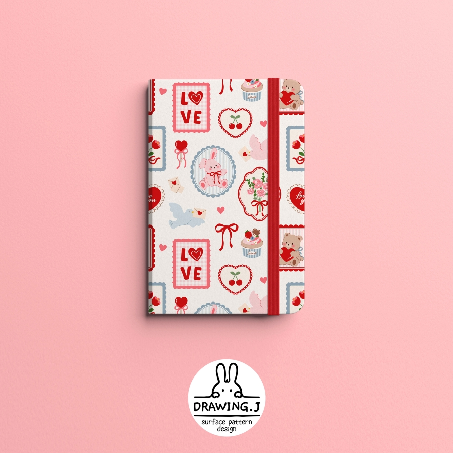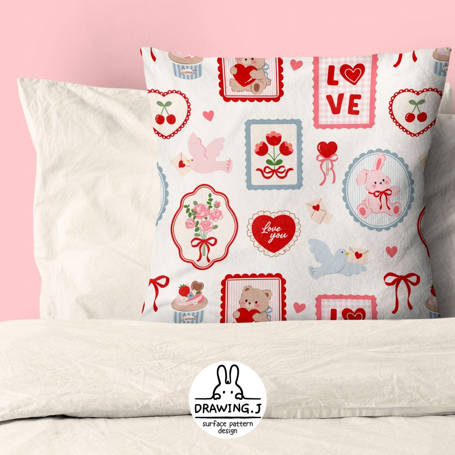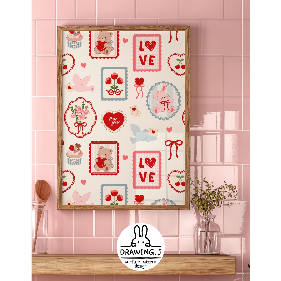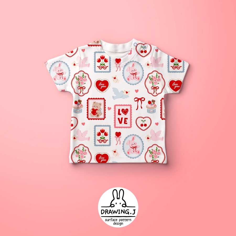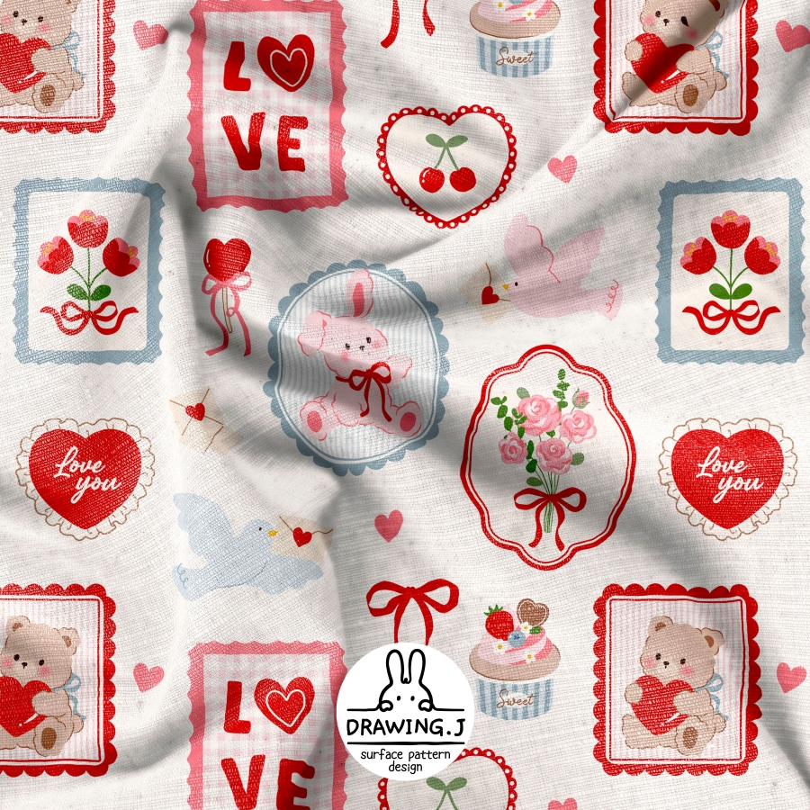 Design infomation Pattern with motifs such as teddy bear, rabbit, heart, flower, bird, ribbon, etc. in lovely frame