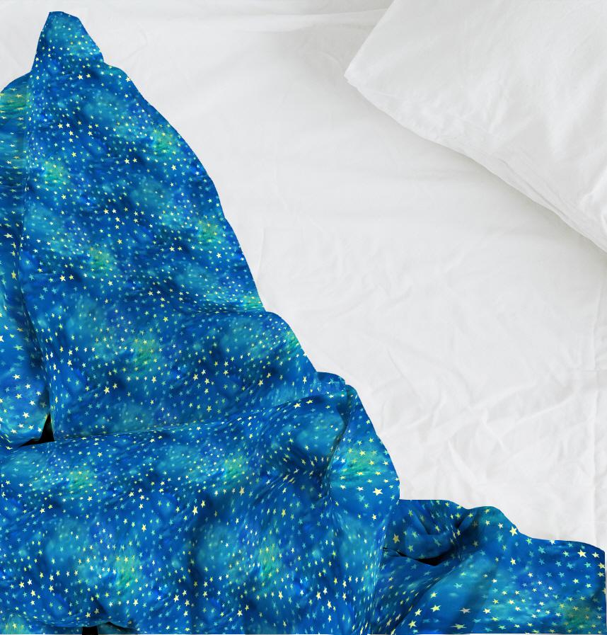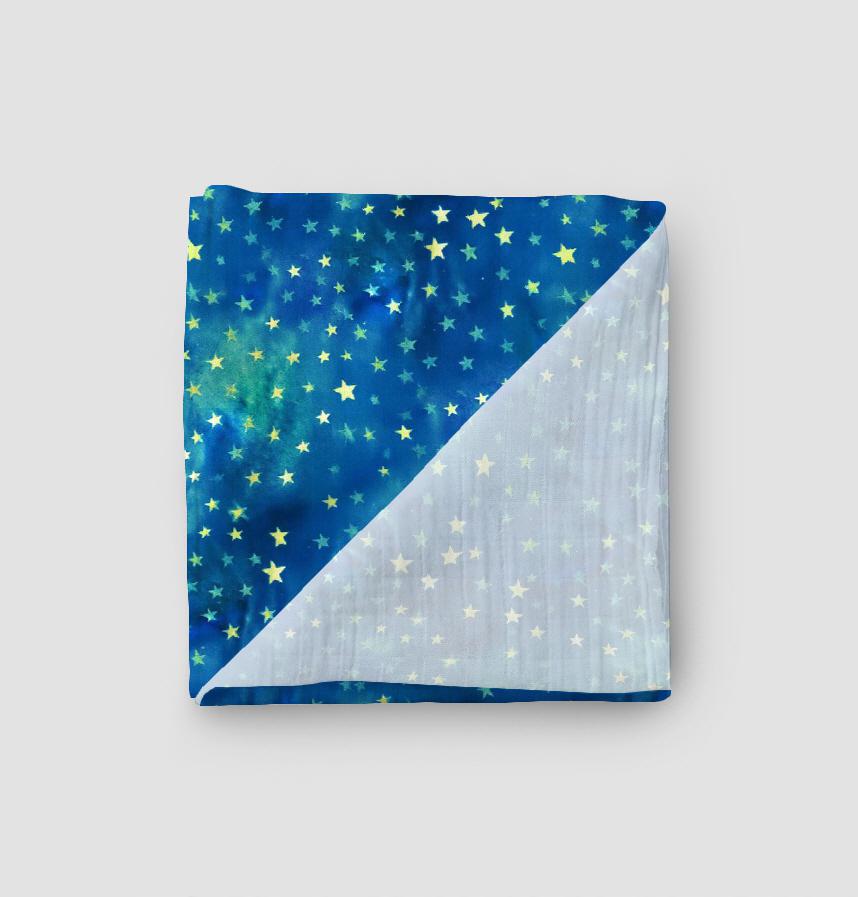 A fantastical night sky pattern with stars falling gently against a background that looks like smudged dark blue ink.