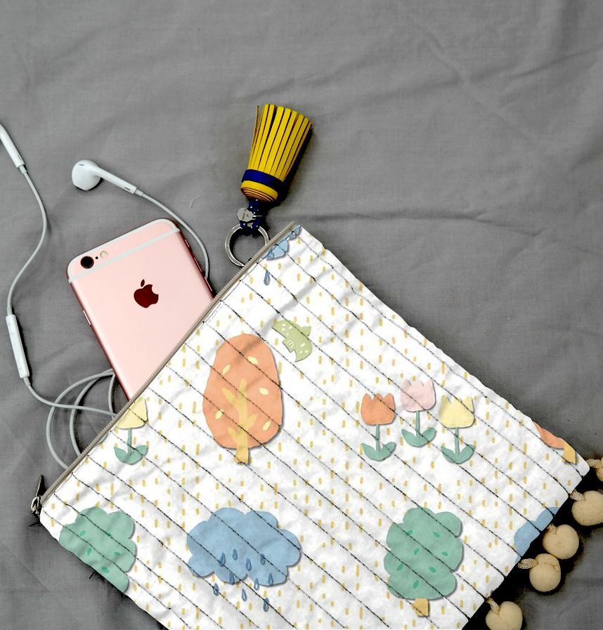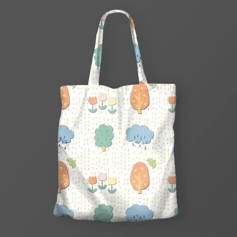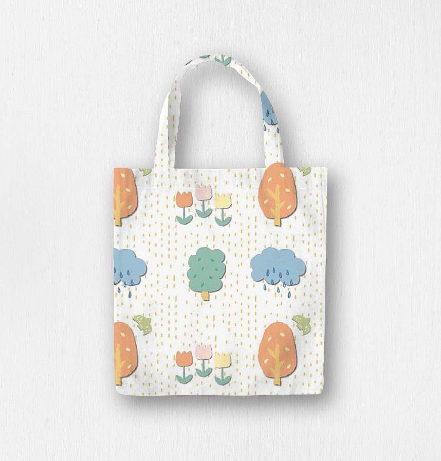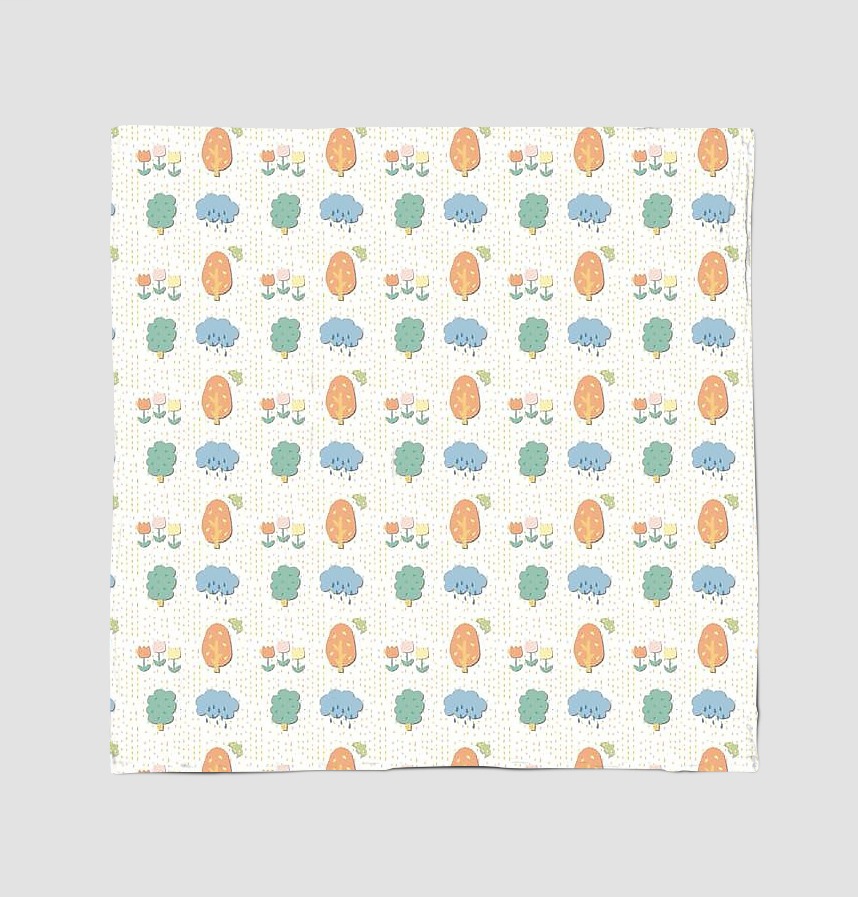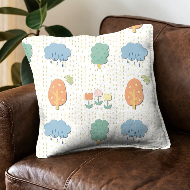It is a harmony of trees, tulips, and moist rain-bearing clouds painted in soft pastel colors 'healing nature pattern'.