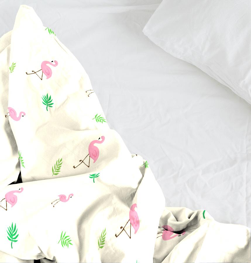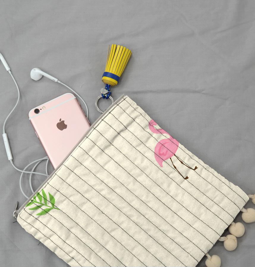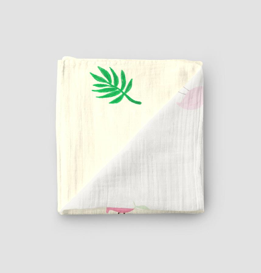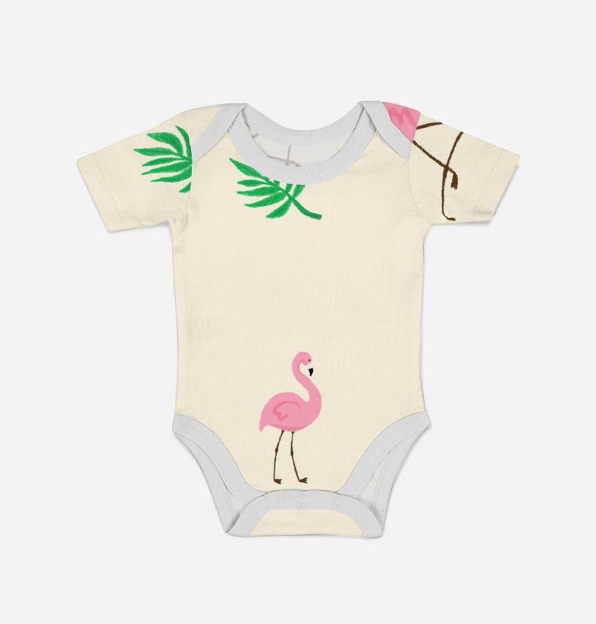 This design features pink flamingos and vivid green leaves for a simple yet cute look.