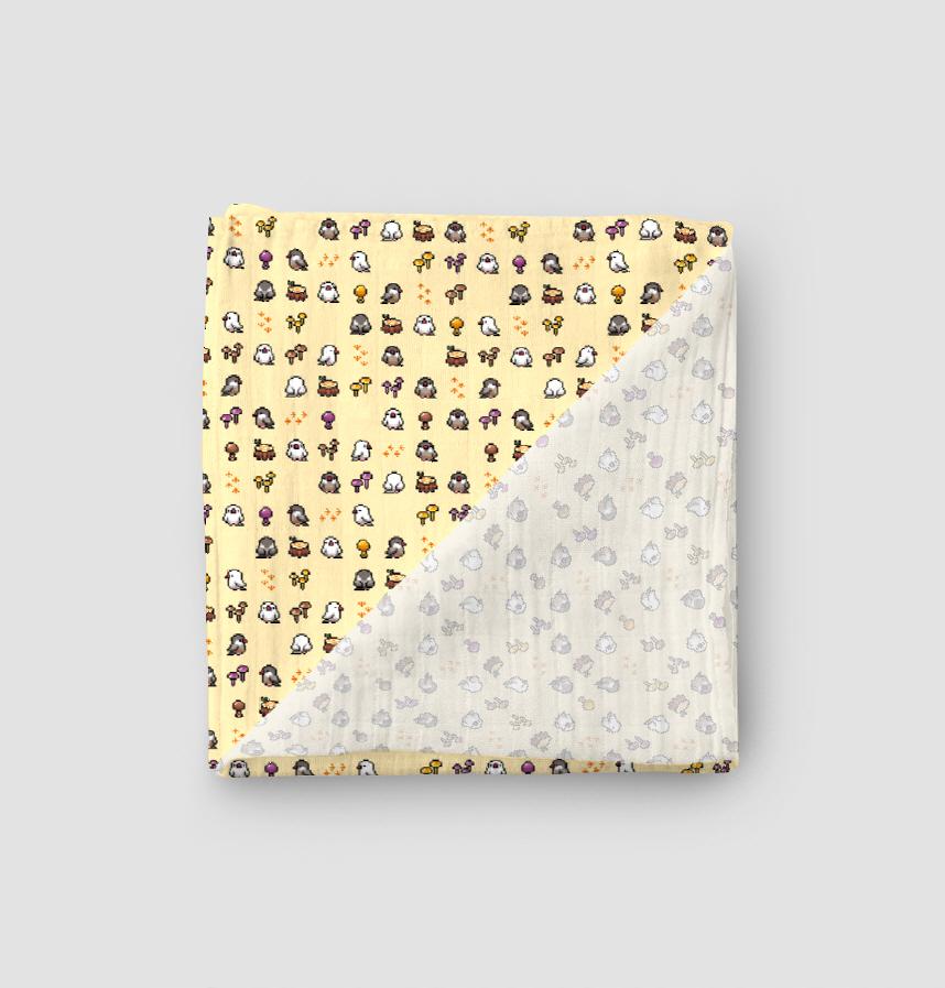 This is a pixel art of a mushroom and a little bird. |