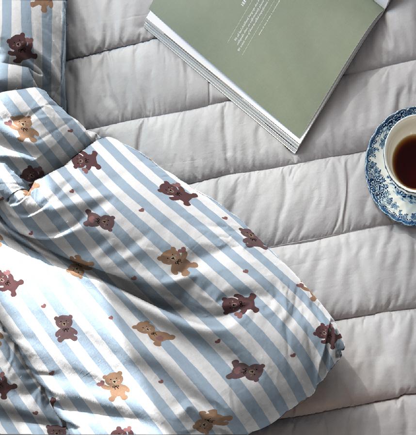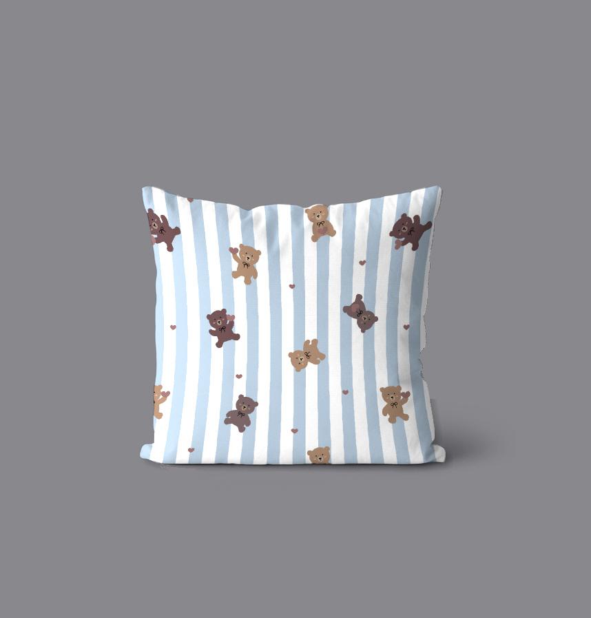 It features a blue striped pattern and a cute baby teddy bear pattern design.