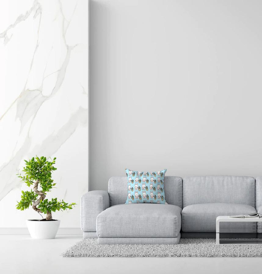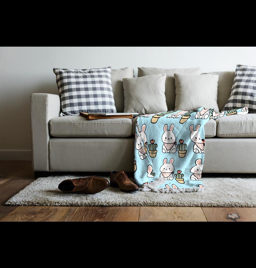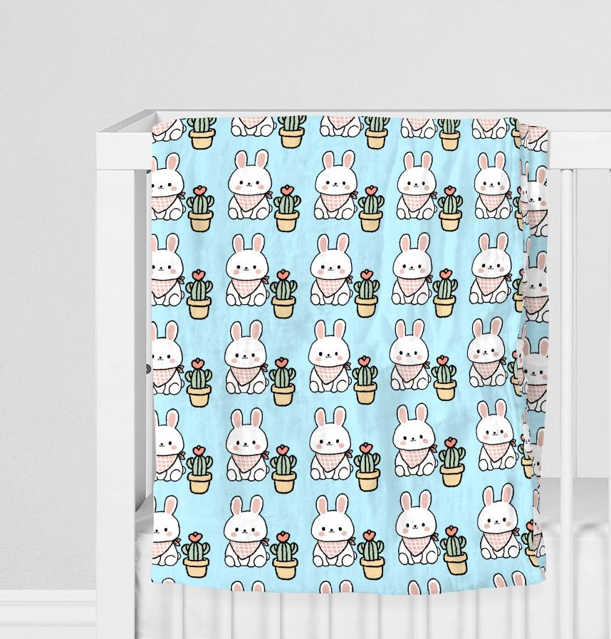 A pattern with cute rabbits and cacti placed symmetrically on a soft pastel background. The rabbit is wearing a checkered scarf, and the cactus has a design with small heart flowers, adding a lovely and babyish feel.