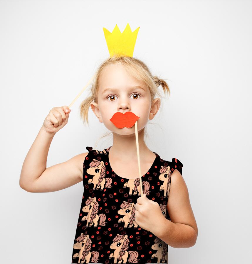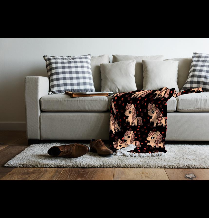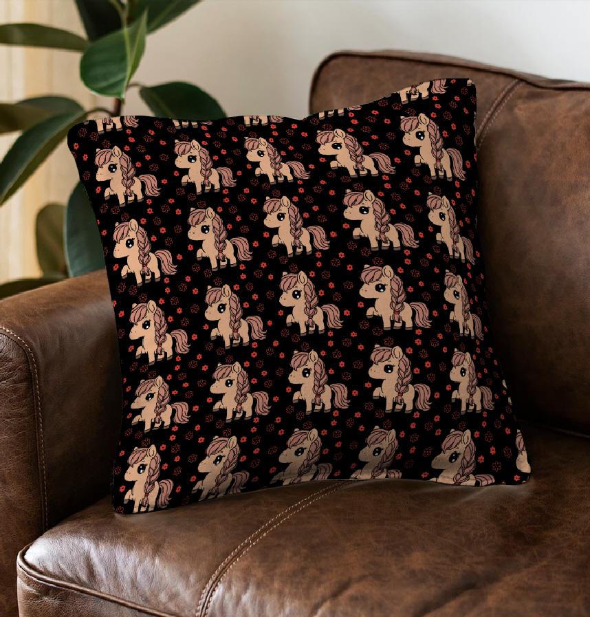 This design features a braided pony as the central element, contrasting the lively appearance of the pony with the bright floral pattern. The black background makes the colors of the pony and flowers stand out even more, creating a look that is both luxurious and cute.