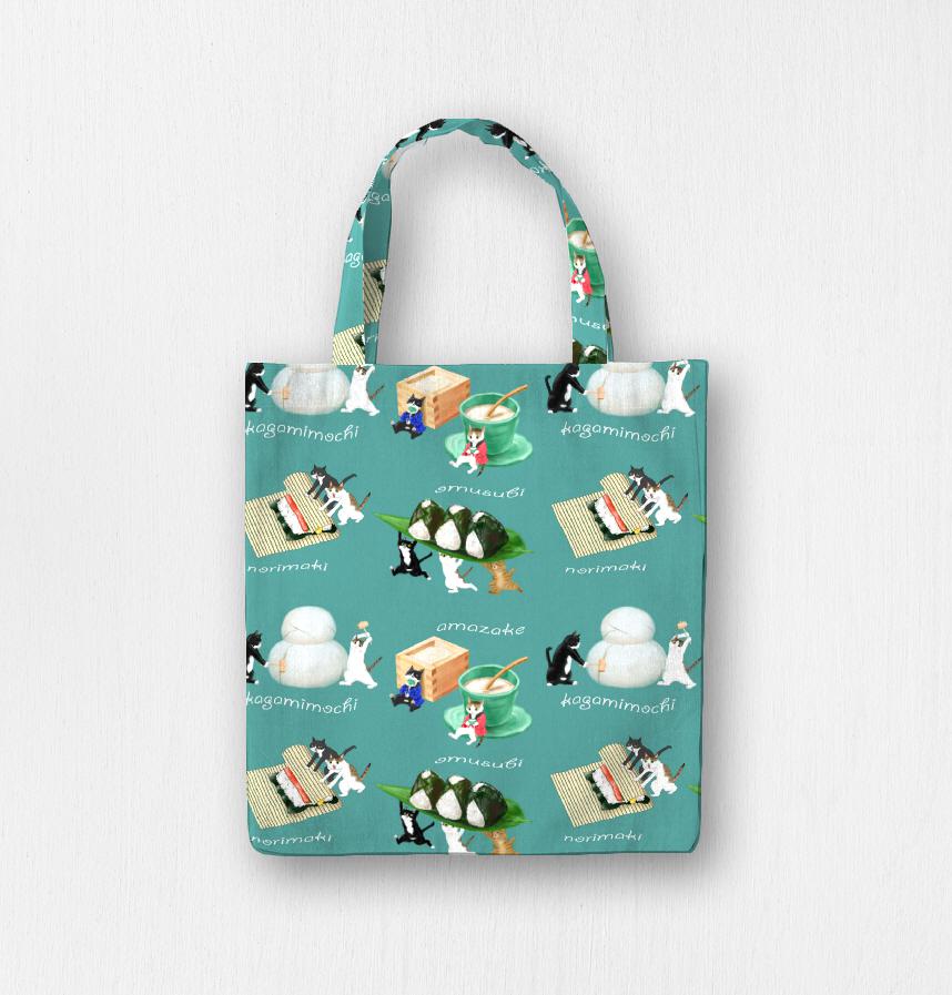 Little kitties bustling around rice foods (Kagami mochi, sweet sake, norimaki, and omusubi)