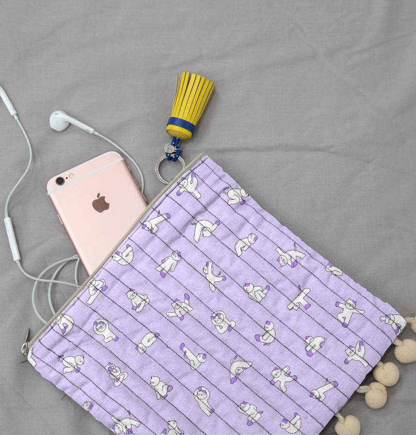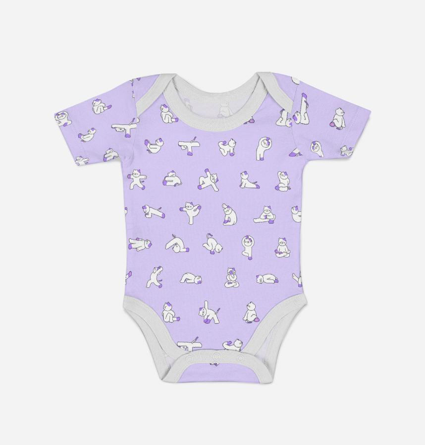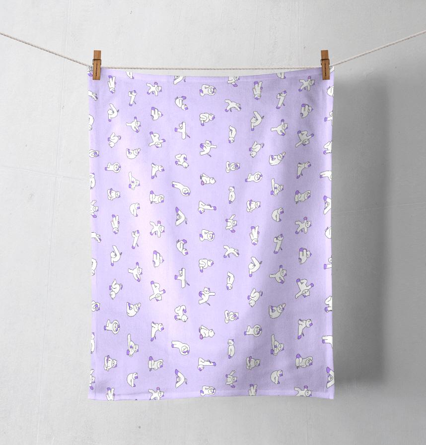 Each cat is enjoying meditation and stretching on a comfortable purple background.