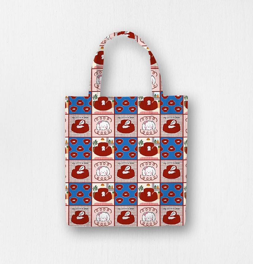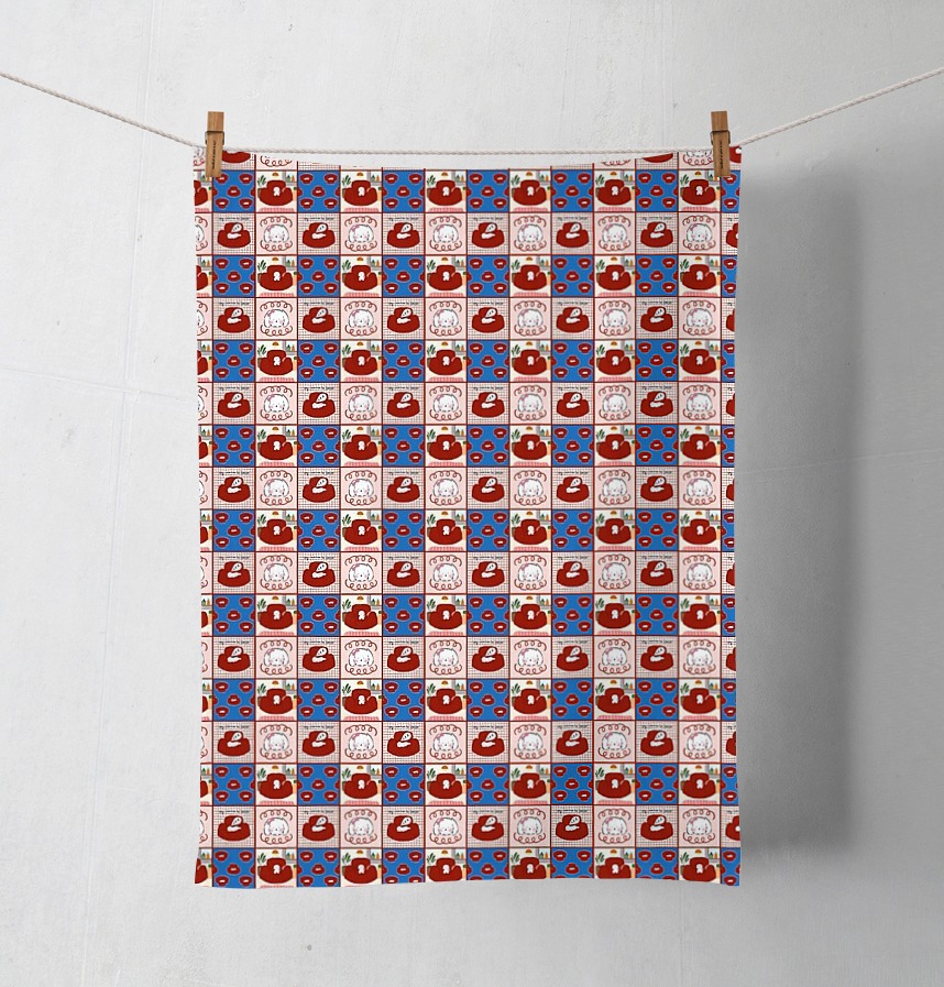 ところどころに顔のクローズアップやリボンのモチーフが加わり、可愛らしくて遊び心のあるアクセントになっています。背景もチェック柄や単色、ソファのパターンなどがバランスよく組み合わされていて、リズム感のあるデザインに仕上がっています。