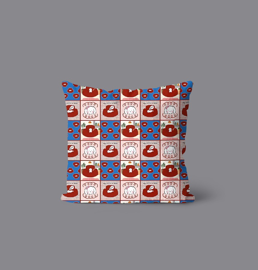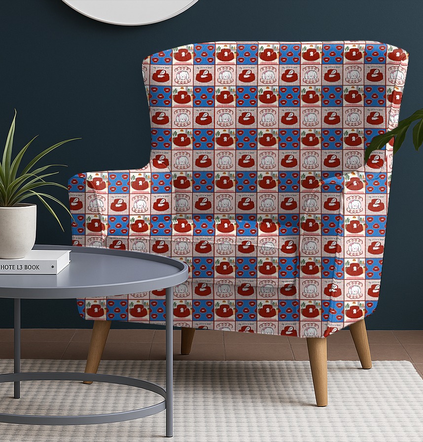 The background consists of a variety of configurations, including check patterns, monochromatic colors, and repeated patterns of sofas, which lead to a rhythmic, non-boring experience. Overall, the combination of red, pink and blue colors is harmonized to deliver a warm and lively sensibility.