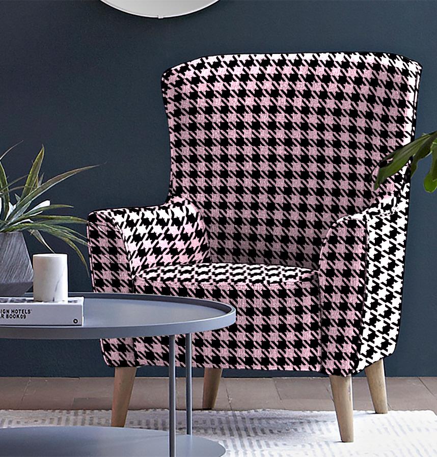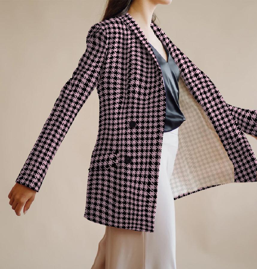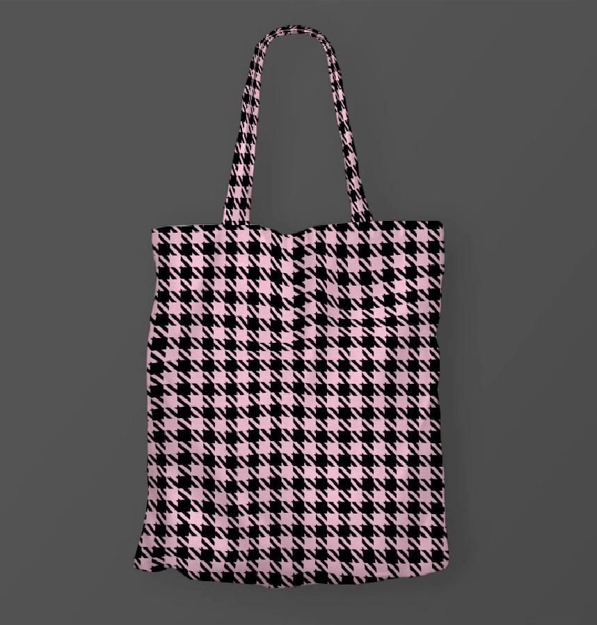 It has a pink and black houndstooth pattern.