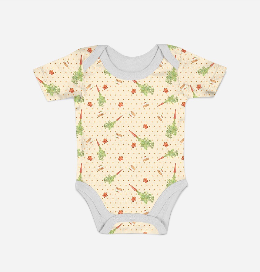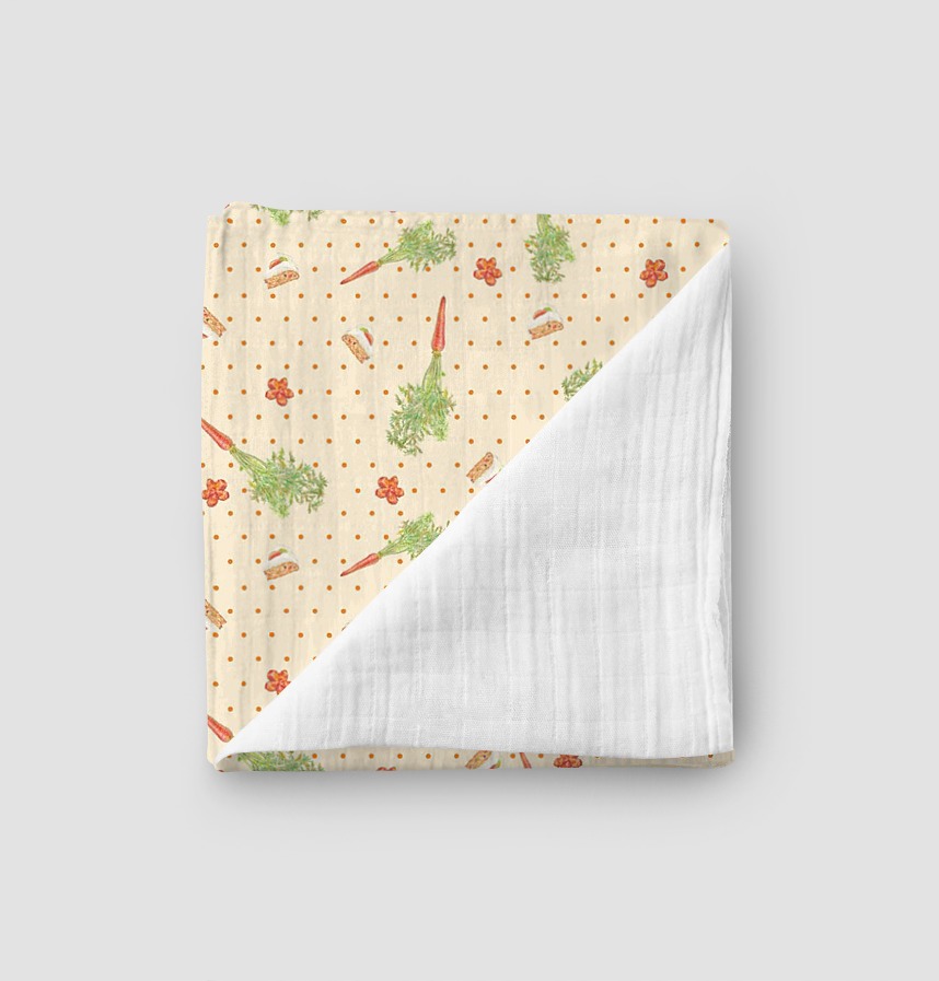 Carrots, carrot cake, and a polka dot pattern sprinkled with decorative carrot slices.