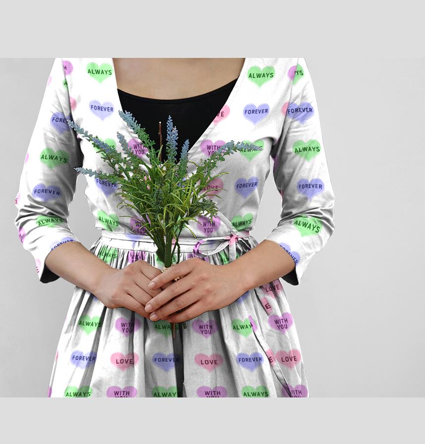 A white background pastel-toned color and an embossed-style love message in a heart