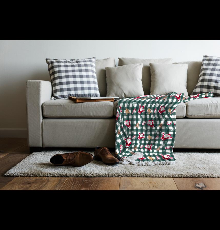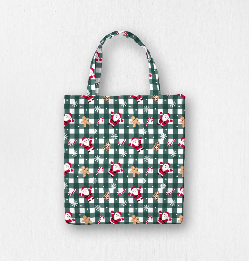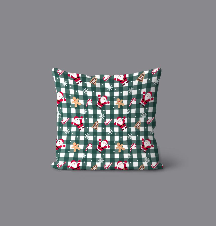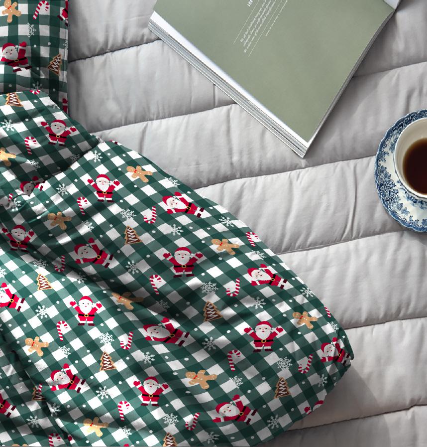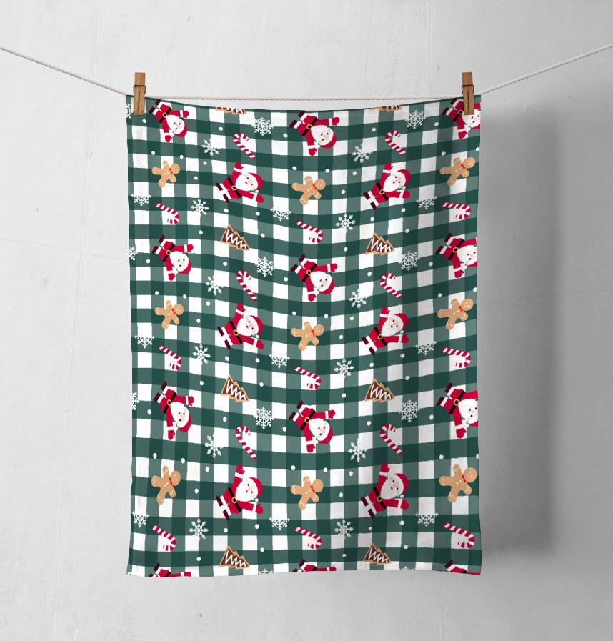 This design captures the warmth of Christmas with a green check design featuring Santa and cookies.