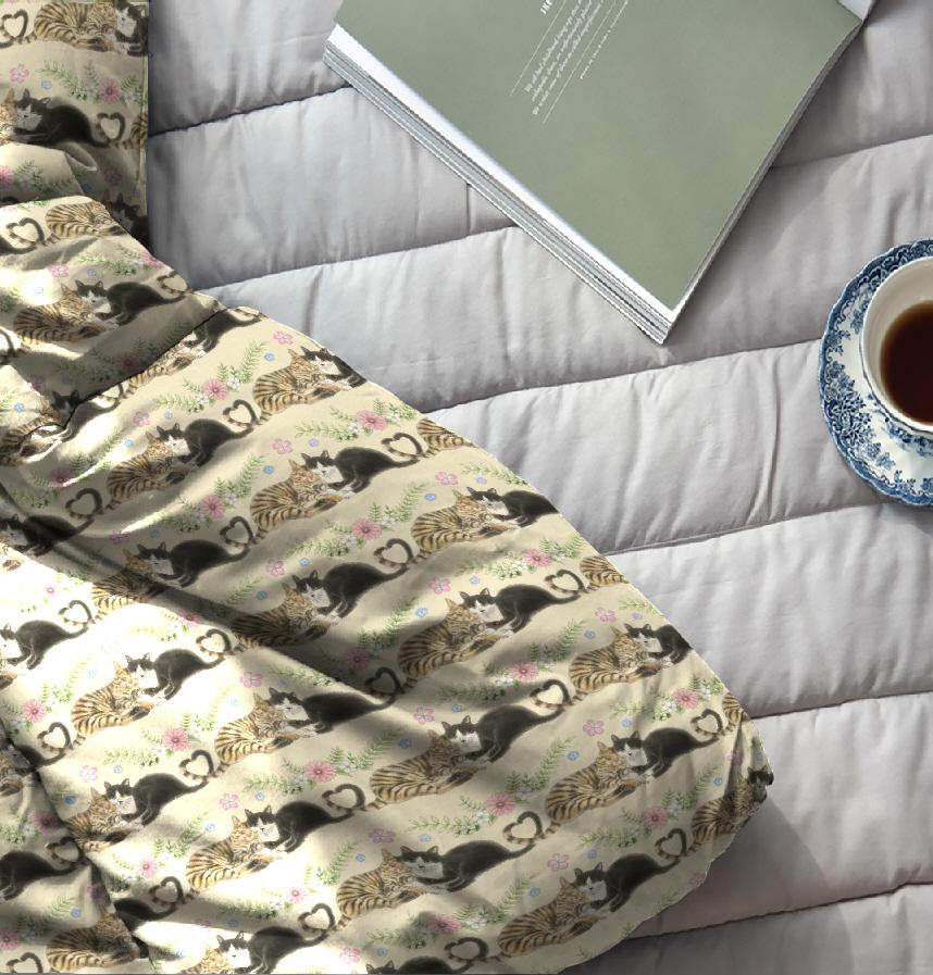 This is a continuous pattern of a Hachiware cat and a yellow tabby cat cuddling together. The tails intertwine to form a heart.
