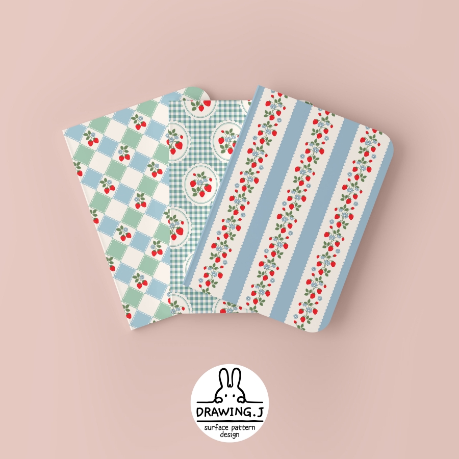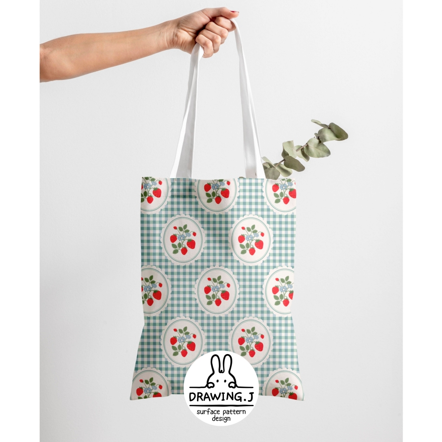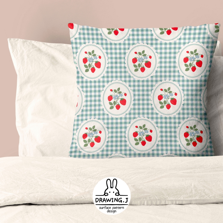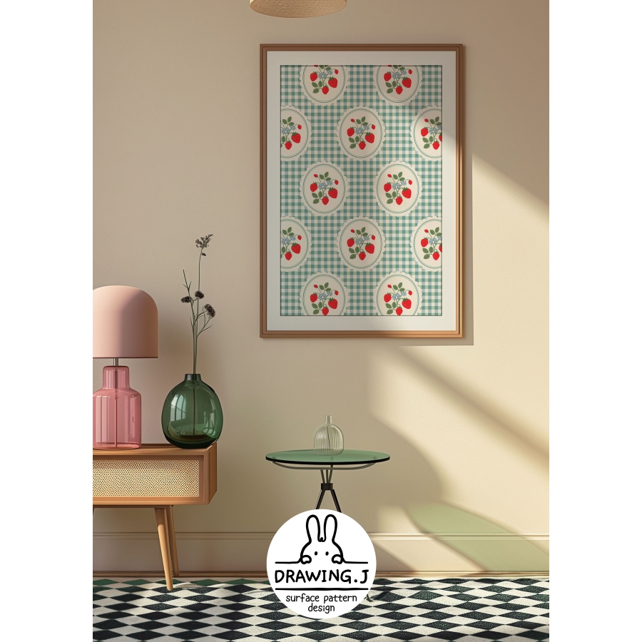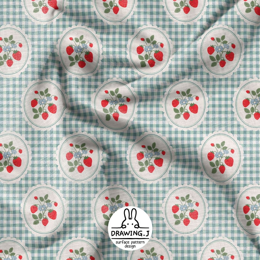 Seamless pattern featuring vintage-style strawberry motif on soft green gingham check background |