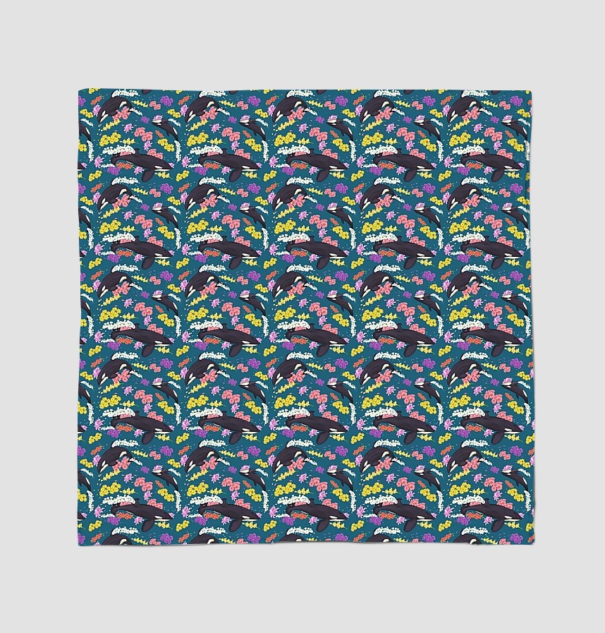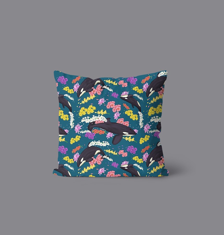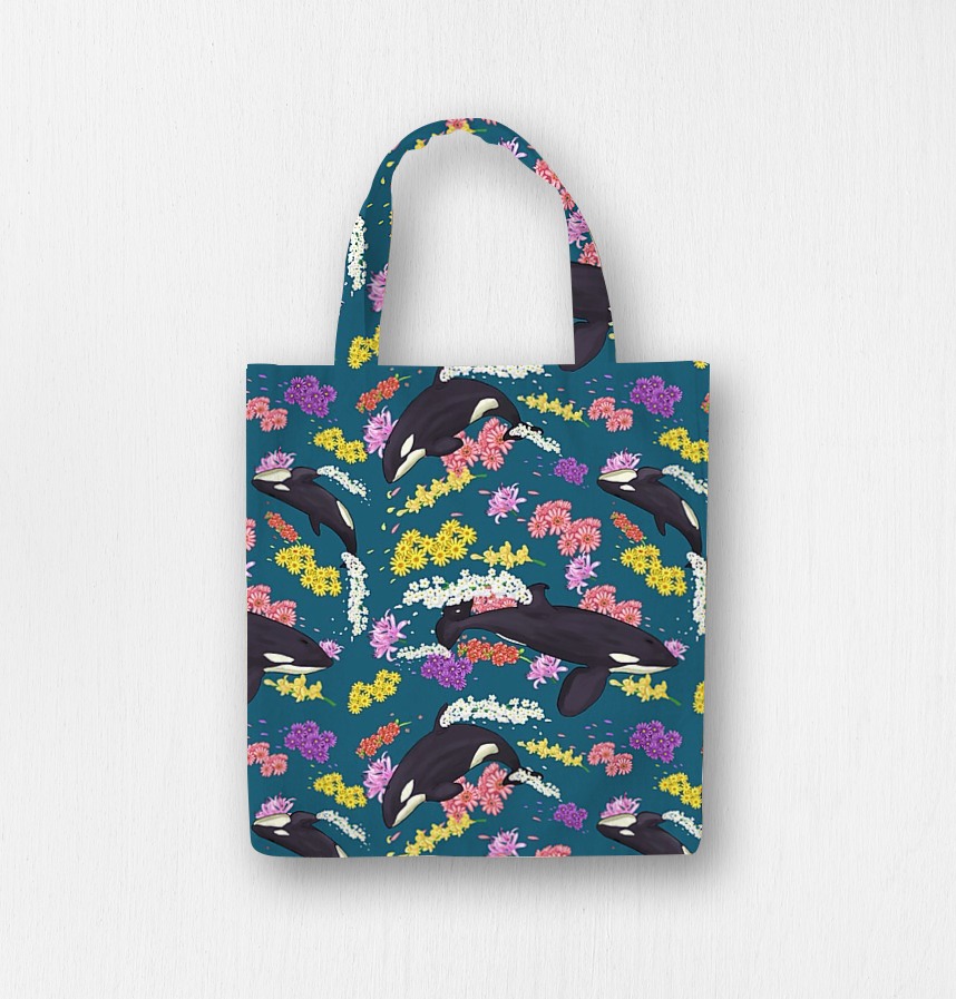 It is a design that depicts a killer whale swimming in the sea of various flowers as a whole. |