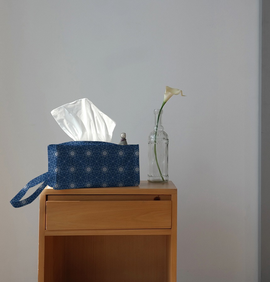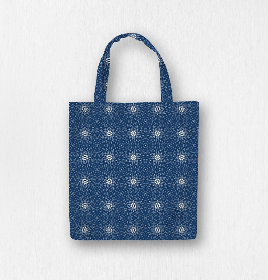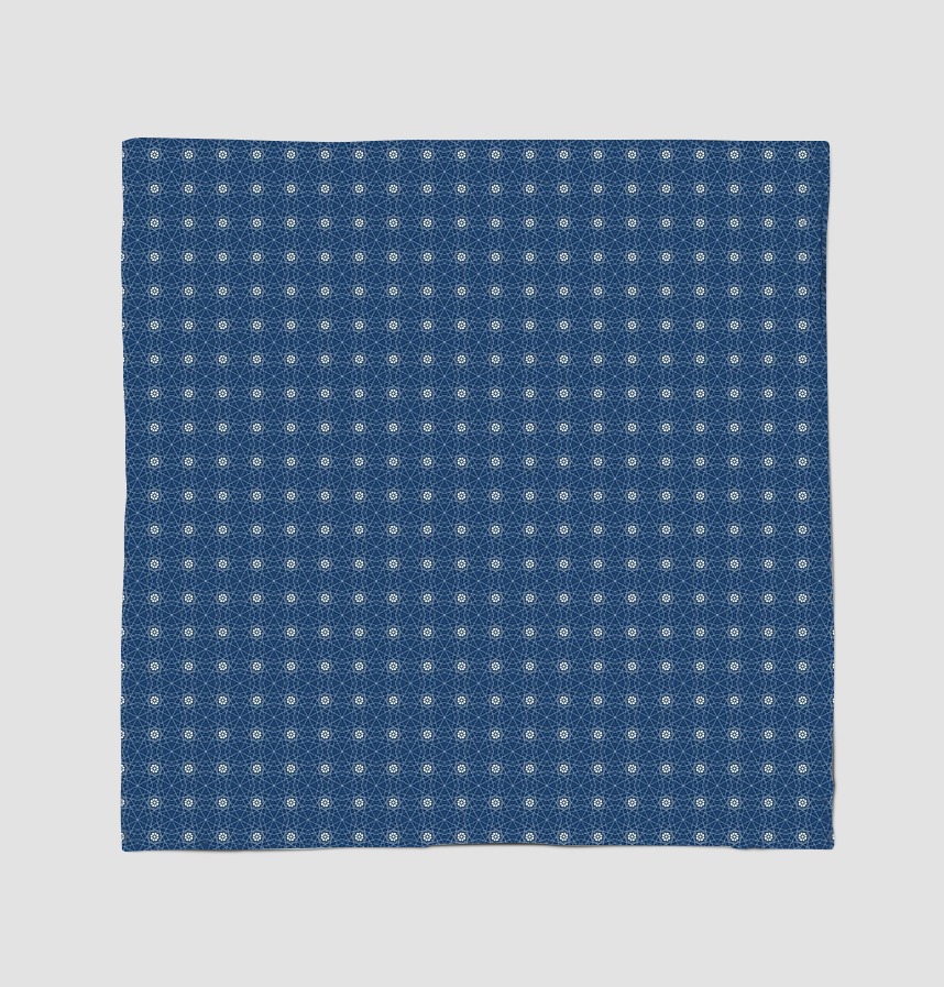 A polygonal geometry of fine white lines over a deep navy background fills the front, with white flower motifs placed within hexagonal borders at regular intervals. The combination of delicate lines and floral elements creates a luxurious and elegant atmosphere and goes well with clothing and home textile. |