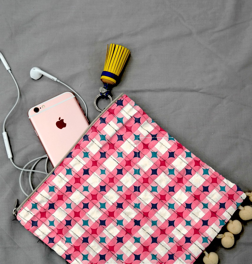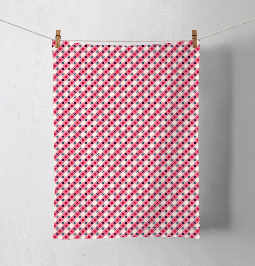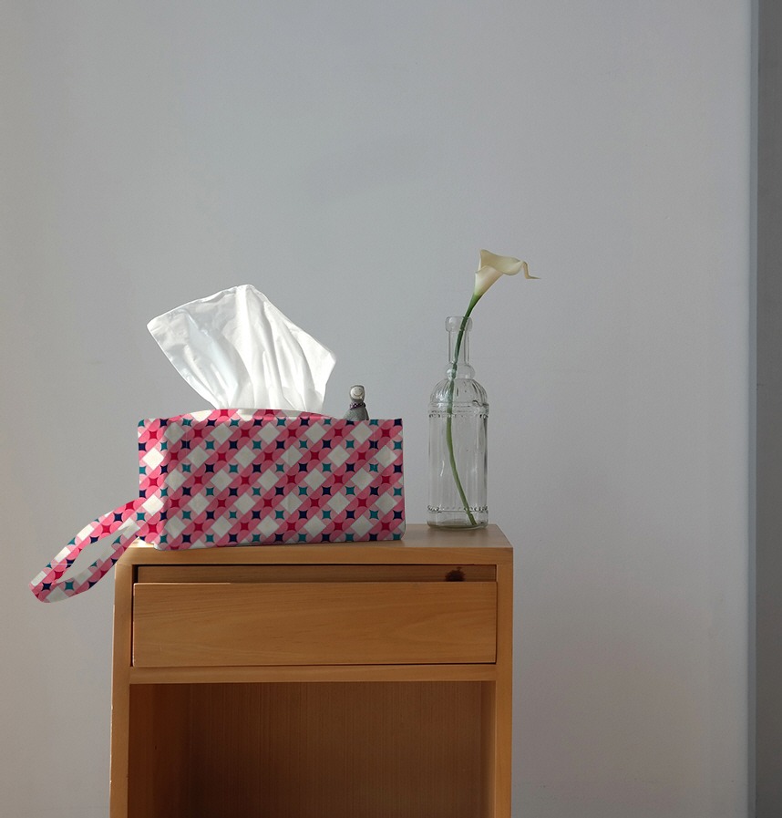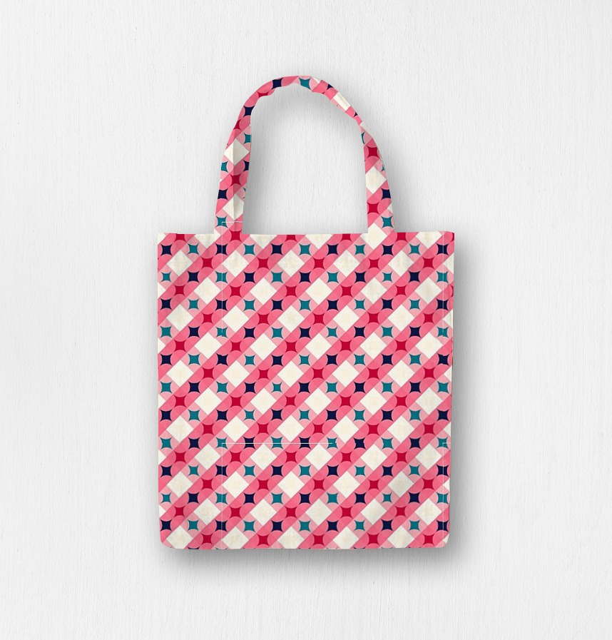 It is a geometric repeating pattern in which pink circular shapes and cream diamond squares are intersected in a diagonal direction, and red or navy/tear color quadrilateral shape points are created at each point where the circles overlap. It is a bright and cheerful color combination that goes well with fabrics, wrappers, and stationery. |
